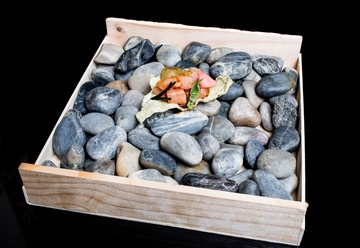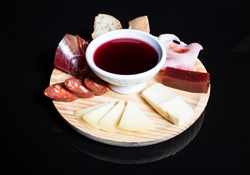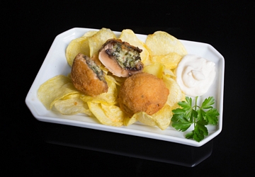 Ingredientes: Champiñóns, espinacas, queixo azul, touciño, viño branco, allo, sal mariño, ovo, pan relado, aceite de oliva, patacas e salsa alioli