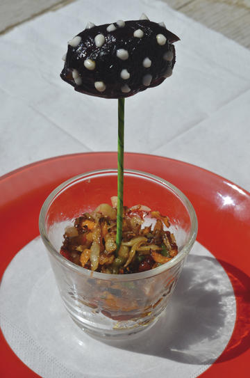Albóndega de pescada do pincho de Burela en mollo verde con certificación MSC con mollo verde en niño de pataca.