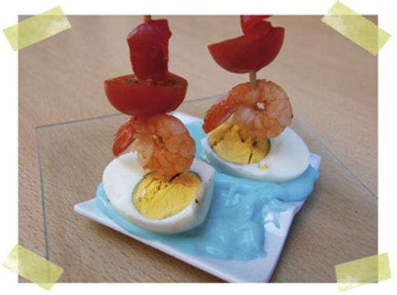 Barquiño de ovo, gamba e cherry sobre base de maionesa. Tapa para celíacos e Tapa Ribadeo.