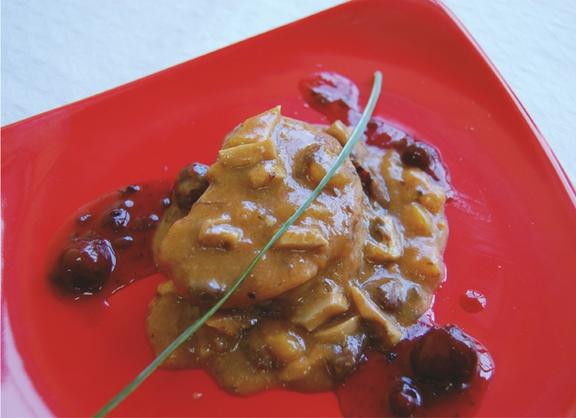 Solombo de porco ibérico sobre base de pan con mollo agridoce