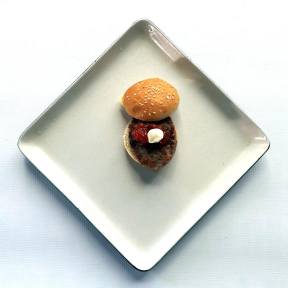Tapa creativa. Ingredientes: Pan de Neda, marmelada de tomate, hamburguesa e queixo Camembert.